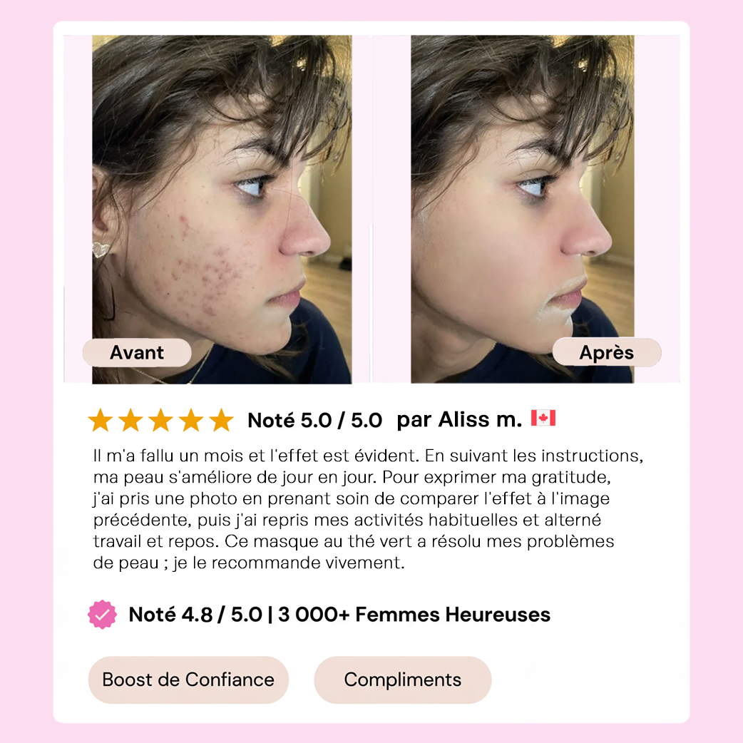 J'ai la peau grasse, ce qui bouche mes pores et me donne beaucoup d'acné. Me maquiller aggrave mon acné. Un jour, j'ai découvert ce masque au thé vert. Je l'ai utilisé matin et soir, et après deux semaines, ma peau est nettement plus belle. Grâce à ce masque, me maquiller n'est plus un problème. Je ne peux plus m'en passer. Si vous hésitez encore, n'hésitez plus.