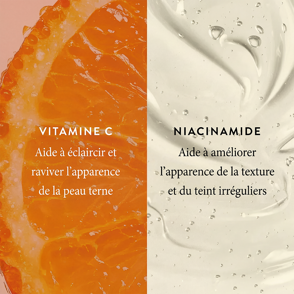 - Enrichie en vitamine C et en niacinamide pour aider la peau à se sentir rafraîchie et hydratée.